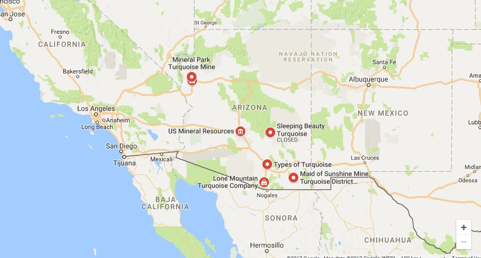 Arizona Turquoise mines were the Sleeping Beauty Turquoise mine and the Copper Queen Mine in Bisbee Arizona and the Morenci Mine in Greenlee County Arizona which now is the only one open and it is one of the largest copper mine reserves in the U.S. and Turquoise is actually a bi-product of copper mining. The story goes that from many years ago because Turquoise was not as popular and the mines were copper mines, the miners would carry the turquoise out in their lunch boxes and sell to a local collector there near the Sleeping Beauty Mine. We do have our contacts there in Arizona and this is how we were able to acquire our stock of this beautiful Turquoise gemstone.